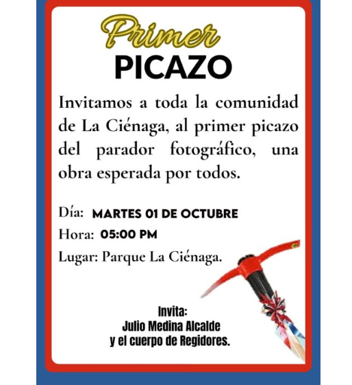Mañana Martes 01 de octubre será el Primer Picazo que dará inicio a la construcción del PARADOR FOTOGRÁFICO de nuestro Distrito Municipal La Ciénaga.